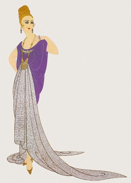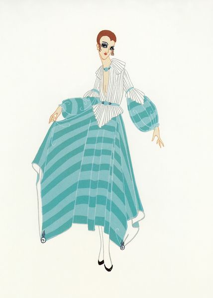 Erte's "Nicole," made with gouache and ink, is a window into the opulent world of early 20th-century fashion illustration. The artwork's delicate rendering of fabric and form speaks volumes about the culture of couture in which Erte was immersed. With its fluid lines and precise detailing, the drawing captures the elegance and sophistication sought after during the Art Deco period. The processes used, like the detailed application of gouache paint to paper, reflect a skilled artistic practice. Erte’s artwork provides a glimpse into the fashion industry during a period of rapid change and increasing consumerism. The figure’s dress, defined by geometric patterns and layered ruffles, highlights the shift towards mass production and global trade, which in turn reflects the changing dynamics of labor and class in the early 20th century. Ultimately, “Nicole” reveals the importance of both materials and context in understanding the full meaning of the artwork.