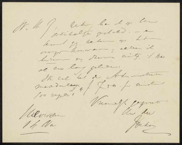 Jozef Israëls wrote this letter to Pieter Haverkorn van Rijsewijk in 1894, likely with a quill and ink on paper. The simple materials belie a complex relationship between labor and artistic expression. The flow of the ink across the page, the pressure and release of the artist’s hand – these are all direct traces of Israëls’s presence. The letter is an artifact of daily life and a testament to the labor of communication. Calligraphy itself, like other forms of skilled handwork, occupies an ambiguous place in the hierarchy of art. It demands a level of mastery and precision. The act of writing, especially in a pre-digital age, was a task performed with care and attention. Letters were not merely functional; they were also embodiments of personal connection. In an era defined by industrial production, handwriting retained a human touch that machines couldn't replicate. Understanding this letter involves recognizing the value of everyday materials and the skilled hand that brought them to life. It encourages us to rethink the boundaries of art history and consider the labor embedded within the creative process.
