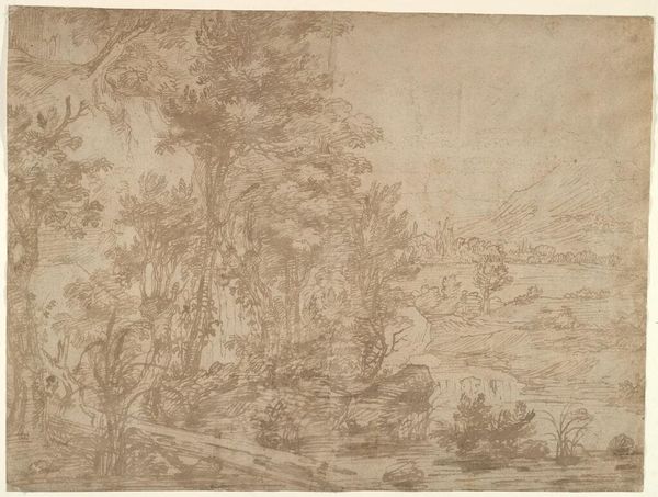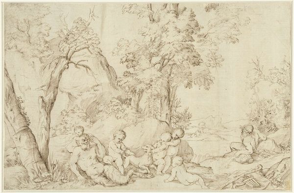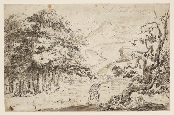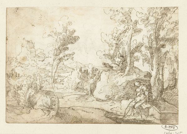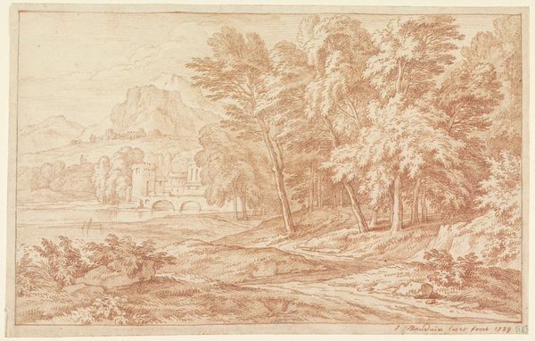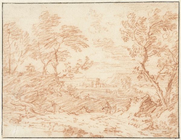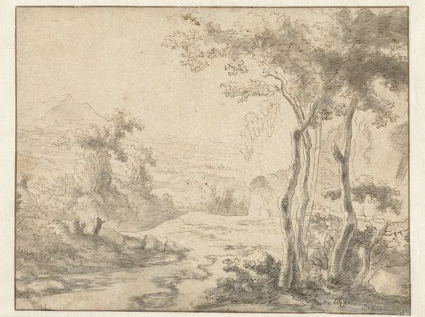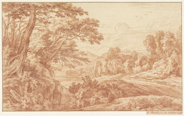 Editor: Here we have Frans Boudewijns' "Italian Landscape with a Tree by a Rock," created sometime between 1700 and 1766, employing etching and tempera. I am struck by the almost dreamlike quality evoked by the delicate lines, but it also feels carefully constructed. How do you see this piece, particularly regarding its techniques? Curator: It is intriguing to examine the means of production here. The etching process itself, the way Boudewijns uses the resist and acid to create those delicate lines you mentioned – it’s a form of industrialization, right? And tempera too, a pigment-based process of adding colour and texture – that brings labour into the work in very specific and skilled ways. It is fascinating when considered as part of the rise of landscape art, and its connection to land ownership and nascent tourism in that era. What statement do you think Boudewijns might have been making with these landscapes and techniques, beyond just capturing a scene? Editor: I see what you mean, it’s not just the landscape, but the labor *behind* the landscape, both physically with etching and also economically in terms of landowners and viewers. The actual etching feels really controlled; did he possibly do more preparatory drawings? Curator: Probably. He could be responding to a market hungry for picturesque views, maybe subtly critiquing the romantic ideal by showing a manufactured, almost 'mass-produced' version of nature. What is hand versus mass-produced becomes blurry, right? Editor: Absolutely. It reframes my thinking of the work to consider both this artistic hand at work, but how its commercial availability factors into it. It makes the image less idyllic, somehow. Curator: And more deeply embedded in its time, perhaps, with attention on its process. Thinking about the material history can do that. Editor: I'll certainly look at landscapes differently now. Thank you!