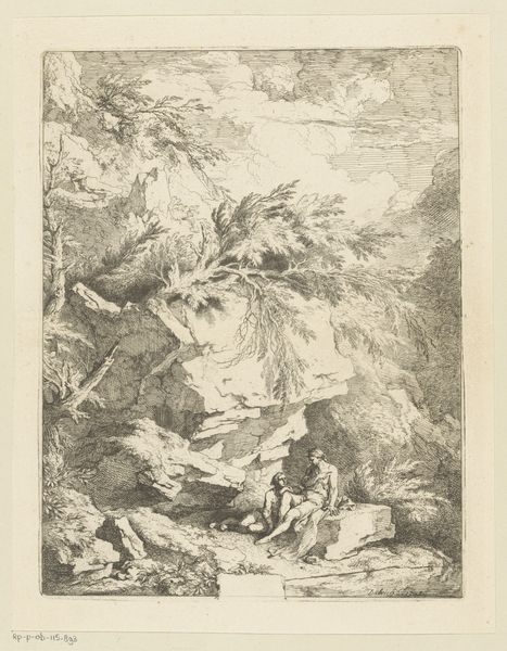 Crescenzio Onofri’s etching, "The Withered Tree," captures a landscape in delicate lines, likely created in the late 17th or early 18th century. The monochromatic palette focuses attention on the structural elements within the composition. The artist uses line to create tonal variations. The texture is rendered through dense cross-hatching in the foreground, which gradually lightens towards the distant, smoky mountains. This is achieved by varying the proximity of lines to one another. The barren tree dominates the composition, its form twisted as it echoes the ruggedness of the landscape. Considered from a semiotic viewpoint, the withered tree and tumultuous sky might function as signs pointing beyond their literal representation. They may hint at themes of decay, transformation, and the sublime power of nature that destabilizes established meanings about life.