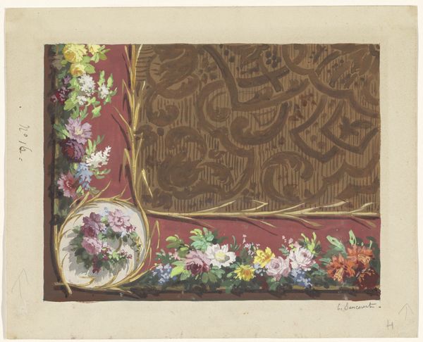 Ernest Capaldo created this textile design with an unknown medium sometime in the 20th century. The work immediately strikes one with its bold geometric organization and contrasting colors. The composition is clearly divided, featuring a bright red field bordered by stylized leaf patterns against a neutral backdrop. This contrast creates a dynamic visual tension, simultaneously inviting and repelling the gaze. Consider how Capaldo employs a semiotic system of signs through repeated floral motifs and formal arrangements that do more than just decorate. The flowers and leaves, rendered in a stark black and red palette, exist within a formalist structure that recalls early modernist experiments with abstraction and pattern. The arrangement of elements suggests an interplay between decorative function and symbolic intent. Ultimately, this textile's power resides in its formal tension, illustrating how decorative arts can challenge fixed ideas about space, perception, and representation. Such designs invite ongoing interpretation, reflecting shifting cultural and philosophical discourses.