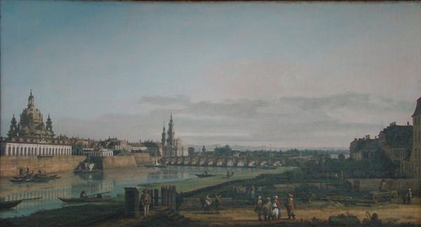 Editor: Here we have Bernardo Bellotto's "Dresden from the Right Bank of the Elbe, above the Augustusbrücke," painted in 1747 using oil on canvas. What strikes me is the sheer amount of detail – it feels almost photographic, yet so deliberately composed. How do you interpret this kind of precise rendering within its historical context? Curator: It's tempting to see it as simply a record, but Bellotto’s "Dresden" speaks volumes about the ambitions of the Saxon court and the burghers of Dresden at the time. The painting serves almost as propaganda, emphasizing the city's prosperity and stability. It's not just a neutral landscape; it’s a carefully constructed image intended to project power and sophistication. Notice how the architecture dominates, overshadowing the everyday people? What might that signify? Editor: That makes sense! The people seem almost incidental, part of the scenery rather than the focus. So the painting isn't just *of* Dresden, it’s *about* Dresden's socio-political structure? Curator: Precisely! Bellotto’s style, highly detailed and perspectivally accurate, aligns with the Enlightenment’s emphasis on reason and order. The ruling class used images like these to legitimise their power, connecting it with progress and enlightened values. We should also consider the patronage system – these works were commissioned, directly influencing their content and message. Editor: So the artwork acted as a sort of visual communication. It really puts a different lens on how I look at cityscapes of this era. It's no longer just a pretty picture. Curator: Exactly. Examining the social and political underpinnings reveals layers of meaning often missed in purely aesthetic appreciation. Editor: I never thought of it that way before. Thanks! Curator: My pleasure! There's always more than meets the eye with these historic works.