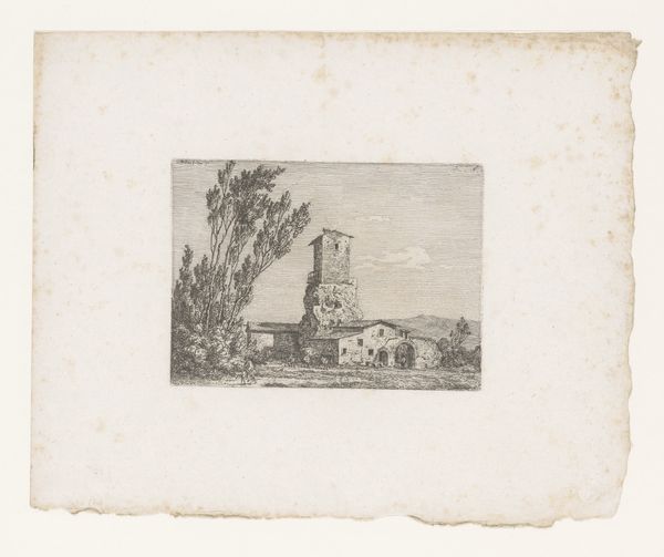 Curator: Ah, here we have "Italian Landscape with a Roman Church," crafted in 1792 by Jacob Wilhelm Mechau. This piece, an etching really, feels like a whisper from a bygone era. What's your immediate take? Editor: My first impression is stillness. The etching's delicate lines create a world suspended between reality and memory, with the church tower anchoring a sense of timelessness. The figures walking along seem somehow separate from the building they might be visiting. Curator: Timelessness, yes, that's precisely it! Mechau really captured that Neoclassical yearning for an idealized past. The Roman church isn’t just a building, it’s a symbol of permanence amidst the flux of life. I’m always struck by the light. See how it grazes the buildings and leaves those strolling figures almost swallowed by shadow. Editor: The interplay of light and shadow certainly enhances that sense of introspection. The tower almost vanishes into the dense grove of trees – I wonder if that merging symbolizes a cultural memory slowly becoming absorbed into the natural world? There's a cross right on top, drawing all your attention to the place. Curator: Absolutely. It invites contemplation on the Church's role as a keeper of collective memory. But also consider Mechau’s technique here. The etching allows for such incredibly fine detail—look at the subtle gradations in the sky, the way he suggests texture with the smallest of lines. I like to imagine the effort involved and connect to it across centuries. Editor: The scale too adds to that. A print demands closer inspection, inviting a more intimate relationship with the image. These architectural forms stand almost stark against the organic forms. A clear statement, really, of the imposition of ordered structure over a chaotic reality. Curator: It certainly speaks to the Neoclassical project, doesn't it? Finding order, harmony... perhaps even attempting to impose it where it might not naturally exist. Although, perhaps nature eventually wins. Editor: In the long run, perhaps, the symbol overtakes all of reality as well. Looking at it, I find it both compelling and a little melancholic; a poignant reminder of time's passage and the enduring power of symbols to transcend generations. Curator: Melancholy is the right word, a reflective atmosphere lingers. Looking at Mechau's etching is, in a way, about connecting with our own fleeting place within the grand sweep of time, isn’t it?