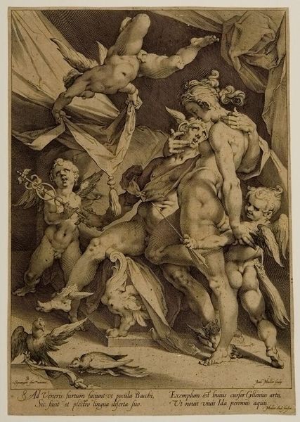 Editor: This is Claude Mellan's "Apollo Crowning Virgil." The dimensions are roughly 35 by 21 centimeters, and it's at the Harvard Art Museums. The scene feels very staged to me. What do you see in this engraving? Curator: It's like a divine photo-op, isn't it? Mellan, bless his meticulous soul, created this entirely from one single, spiraling line! Imagine the sheer dedication – no room for error. It’s a celebration of Virgil, of course, but also a testament to the virtuosity of printmaking. Do you feel the almost sculptural quality, despite it being just lines on paper? Editor: Yes, now that you mention it, I can see the texture. It's amazing to think it's all one line! I'll never look at engravings the same way again. Curator: Exactly! Sometimes the most incredible magic hides in the simplest of techniques. It makes you wonder about the stories behind the line, doesn't it?