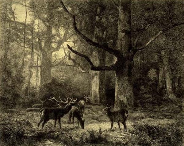 Editor: This is "The German Huntsman" by Gustave Courbet, from 1859, rendered in oil paint. The palette is predominantly earthy, and that slumped stag gives off such a melancholic atmosphere. What structural elements contribute to this feeling? Curator: Note how Courbet uses the dense, almost claustrophobic forest setting to confine the composition. Observe the hunter, positioned slightly off-center, a rigid diagonal against the fluid, organic shapes surrounding him. Editor: That juxtaposition of rigidity and fluidity is certainly striking. Curator: Consider the tonal range, too. The somber darks contrasted with the occasional burst of light falling on the stag create a dynamic visual rhythm. This oscillation reinforces the tension between the hunter and hunted. Editor: So, the formal aspects alone, such as light, shape, and composition, create this charged atmosphere? Curator: Precisely. Semiotically, the arrangement conveys the power dynamics between humanity and nature. The composition, materiality, and visual contrasts all work together to communicate this relationship. Does that influence your interpretation? Editor: Definitely. I see how limiting our focus to the visual and the relational composition unveils so much richness and nuance. I initially focused on the emotional impact, but this deep dive into structure is very helpful. Curator: Indeed, understanding these fundamental components allows for a richer, more grounded engagement with the work. Editor: Thank you for opening my eyes to that, it provides a more complex interpretation than where I started!