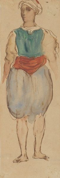 Curator: We're standing before Karl Rössing's watercolor, graphite, and pencil drawing, "In the Harvest Field," created in 1924. Editor: The figure seems so contained, almost austere. There's a quiet weariness expressed by the tilt of her head and the muted color palette, like the landscape itself has leached into her clothing. Curator: Indeed, her clothing carries specific connotations. The headscarf speaks to modesty and rural life, a near-universal symbol of women's roles tied to land and tradition. And look at the water jug that she lifts toward herself. It suggests a quenching, necessary for sustaining her work, symbolizing both physical survival and a deeper, perhaps spiritual nourishment. Editor: From a formal perspective, I'm drawn to how Rössing uses the limited washes of color to define form, contrasting soft blues and reds to describe the heavy fabric of her clothes, grounding her, but in a very ephemeral, airy manner. The sketchiness, too, leaves so much open to interpretation. Curator: Exactly, because the sketch’s openness draws us in. It suggests a universal experience of labor and sustenance rather than portraying this particular individual, but almost an archetypal form of feminine labor in agriculture, reaching back to classical depictions of Ceres. Editor: Yet, despite the overall tranquility, the positioning of her body on the canvas and even the color selection convey something akin to emotional thirst. She almost seems barricaded off from the rest of us, turned away as she ingests, isolated and closed off in a compositionally daring choice. Curator: I agree. She’s connected to a historical narrative of land and sustenance, echoing age-old artistic representations of the worker, but this positioning you noted highlights a personal experience too—one where her nourishment might feel more like a solitude rather than simple replenishment. Editor: Seeing how the simple color blocks establish mass makes this piece work! So much suggested, with the bare minimum executed. I'll carry the visual experience of that color simplicity with me. Curator: The way Rössing merges technique and symbolism definitely elevates this small, rather modest artwork into a really compelling meditation on labor and human need. It encourages a kind of contemplation of our past and shared origins.