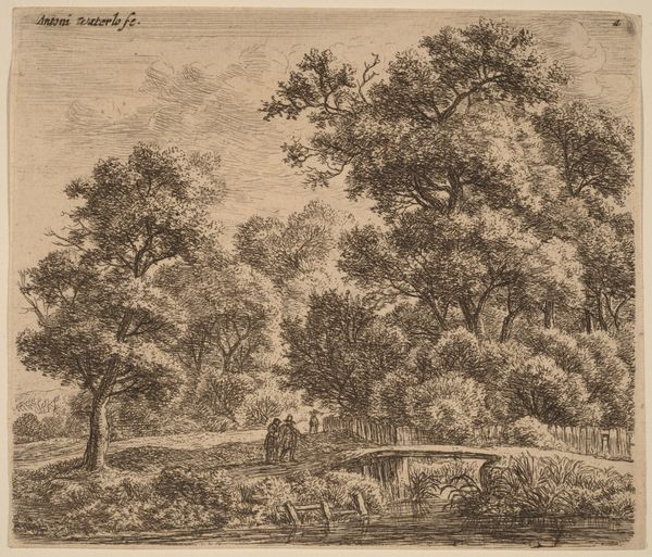 Editor: So, here we have Abraham Genoels' "Haveanlæg med bassin," dating sometime between 1640 and 1723. It's an etching, currently residing at the Statens Museum for Kunst. It feels incredibly precise and ordered, almost like a blueprint for a peaceful afternoon. What do you make of it? Curator: Oh, it sings to me of secret gardens and whispered conversations, doesn't it you? Notice how Genoels uses the etching technique— the lines are so crisp, so deliberate. Imagine him hunched over a copper plate, patiently scratching in this landscape. What kind of atmosphere do you think he's creating? Editor: One of cultivated leisure, perhaps? The symmetry and those tiny figures strolling along the wall...it suggests a very particular lifestyle. Curator: Exactly! This wasn't just any landscape; these were aristocratic fantasies, visions of how the wealthy classes wished to see their world. Gardens as theatres, controlled nature acting as a symbol for controlled society, what do you see mirrored in that reflecting pool? Order, beauty... control, huh? But...doesn't it feel a little bit, hmm, prescribed, for all its delicate beauty? Editor: Prescribed, definitely. Almost a little...cold? Curator: There you go. Beauty without the chaos that makes beauty real is all too frequently empty, just line and tone after all! That tension, that underlying sense of restriction within the image’s tranquility – that’s where the real juice of this print resides for me. Genoels gave the patron exactly what they wanted and a heck of a lot more. It’s kind of deliciously subversive, I think! Editor: That's fascinating. I came in seeing a pretty picture, and now I'm considering its socio-political undertones! Curator: Isn't it wonderful? To peel back the layers of time, line, and intent? Now that, my friend, is truly seeing art!