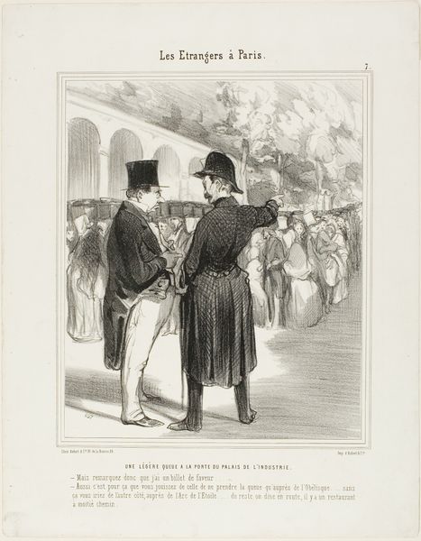 Curator: Here we have a caricature etching by Johan Michael Schmidt Crans, titled "Spotprent op de onverkoopbare aandelen Kanaalmaatschappij, 1863," created in 1863 with pen and etching. What are your initial impressions? Editor: The mood strikes me as rather… tense. The stark black-and-white contrast enhances the sharp lines of the figures, their expressions etched with what appears to be frustration. Note the crowding, too, adding to the visual pressure. Curator: Indeed. Crans created this as a satirical commentary on the financial climate of the time, specifically targeting the unsellable shares of the Kanaalmaatschappij, a canal company. Understanding the history surrounding Dutch financial speculation is essential. It's about power dynamics, the construction of value, and, of course, potential failures. Editor: You see how the artist utilizes a kind of realism to depict the scene, but with heightened, almost grotesque, exaggerations? The elongated faces and strained gestures…It's brilliant how those formal elements contribute to the caricature's overall message. Curator: Absolutely. He's highlighting the social anxieties surrounding the potential collapse of the company and skewering the men—presumably wealthy investors or brokers—caught in its web. The location depicted, "Effectenhoek te Amsterdam," reinforces the economic elite under fire. This can be related to today's neoliberal context: how is financial speculation framed, and who carries risk's social burden? Editor: Consider the visual language, the interplay of light and shadow defining form. It creates depth and emphasizes the characters' psychological states. The use of etching adds a layer of historical context—recalling an era deeply tied to meticulous detail. The drawing method makes it particularly suited to express precision. Curator: The drawing leaves an incisive visual record. The print is also rich in information about the relationship between art, capital and social critique in 19th-century Netherlands. I think that in light of today’s struggles around equality, access and representation, the artist leaves open the following question: "who pays, who wins?" Editor: A worthwhile observation that moves beyond surface aesthetics. Understanding the underlying narrative allows one to appreciate both the technical skills of the artwork and its contextual importance. Curator: Exactly! Editor: Yes, definitely some insightful elements in that perspective. Thank you.