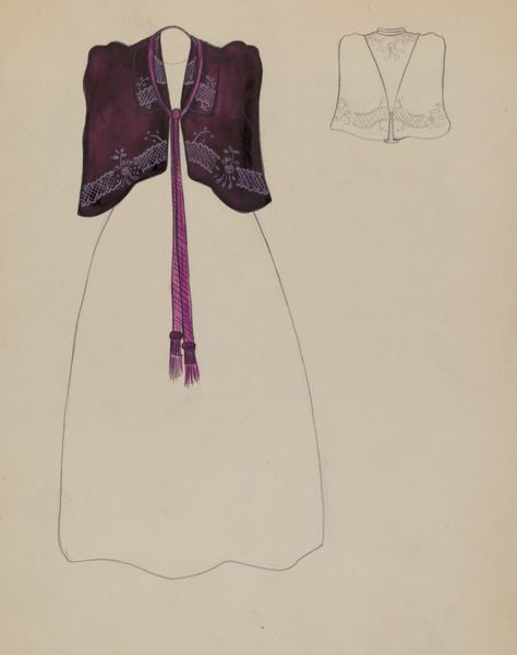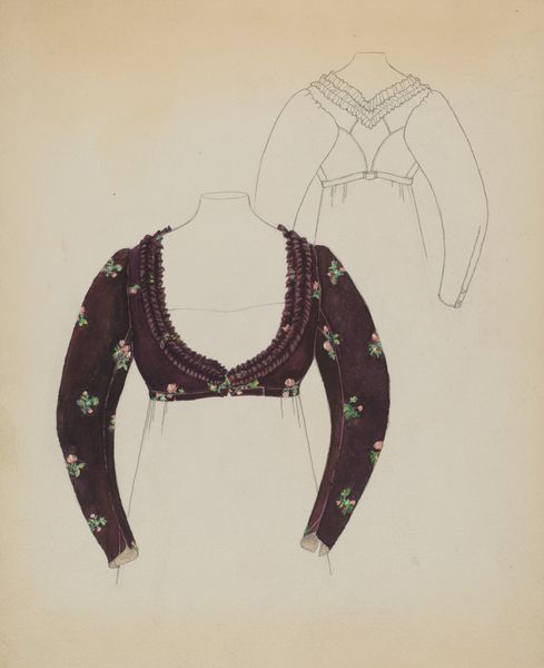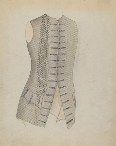 Marie Mitchell, born in 1855, created this watercolour and graphite rendering of a waistcoat. This image provides us with an interesting insight into gendered identity and historical context. Waistcoats in this era were primarily worn by men as part of formal attire, and signified status and belonging within a certain social class. As a woman artist, Mitchell’s attention to this garment may reflect her engagement with, or perhaps a critical view of, the sartorial codes that defined masculinity and social hierarchy. The precision and detail of her rendering suggests an intimate familiarity with the waistcoat’s construction and design. Moreover, Mitchell’s work could be interpreted as an exploration of how clothing shapes and reflects societal expectations. It invites us to reflect on the ways in which garments mediate our identities and experiences, and how artistic representation can challenge or reinforce these dynamics.