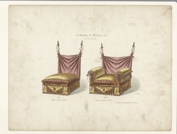 Editor: Here we have "Stoel en fauteuil," or "Chair and Armchair," created sometime after 1878 by an anonymous artist. It’s a watercolor and drawing piece showcasing Art Nouveau design. It's interesting how grounded these chairs seem, like miniature thrones. What catches your eye in this piece? Curator: What a fabulous representation of aspirational comfort! The fact that it appears to be a study for furniture, specifically for a ‘Magasin de Meubles’ or furniture shop, highlights its commercial intent. Notice how the ornate decoration isn’t just aesthetic? It’s deeply embedded in cultural signifiers of luxury and status during the late 19th century. Look at the symmetry, the carefully rendered floral patterns... Do you think these are meant to evoke any particular era or style? Editor: I see what you mean. It's decorative and opulent but…almost stage-like? The colours feel both rich and slightly artificial. Curator: Precisely! This tension between genuine craftsmanship and theatrical display reveals a lot about the desires and fantasies of the period. The floral motifs, while beautiful, also represent a yearning for a natural world increasingly distanced from urban life. It makes you consider, doesn’t it, what 'home' and 'comfort' truly symbolized for people back then. Editor: So it’s less about practical furniture design and more about the cultural image they project? It's interesting how a simple chair can carry all that weight. Curator: Indeed. The image promises belonging, elegance, and a connection to something timeless, packaged for purchase. Editor: It changes how I look at design now! The symbols in plain sight were always there; I never examined their intentions.