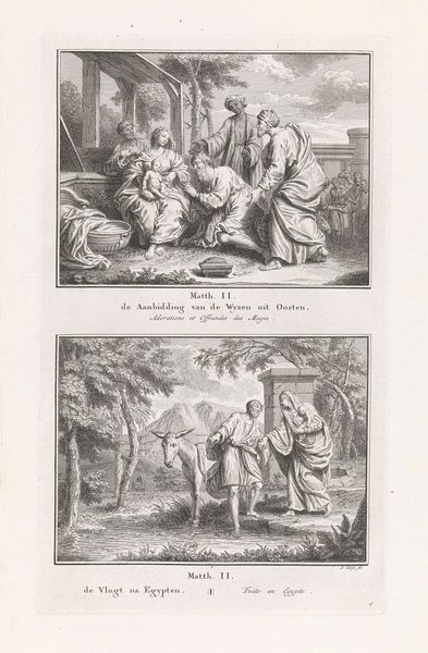 Editor: Here we have Pieter Tanjé's engraving, "Abraham and Isaac on the Way to the Offering Place/The Sacrifice of Isaac," sometime between 1716 and 1791. It's striking how the artist divides the composition into two distinct moments from the biblical story. What strikes you most about this piece? Curator: What's compelling here is not simply the image, but the means of its production and circulation. Engravings like these democratized religious narratives. The Baroque style, typically associated with grand painting, here finds a humbler, more reproducible form. Consider the engraver's labor: the meticulous carving, the press, and its output geared toward wider consumption. Editor: That's fascinating! So, you're less interested in the religious symbolism and more in the physical creation and its distribution? Curator: Exactly. The biblical story becomes secondary to questions of craft, skill, and the accessibility enabled by this printmaking process. It disrupts traditional notions of 'high' art, inviting us to think about labor, materials, and the social context of its creation. The paper itself, the ink - they all speak to a material history. Editor: I see your point. It makes me consider how the meaning shifts when something so grand is brought down to a reproducible medium. How does its availability change the artwork's purpose? Curator: Precisely! We should also consider who would have purchased this and how they might have used it. Was it framed? Pasted into a book? Used for teaching? Its value wasn't intrinsic but rather defined by how it functioned within a specific social context. Editor: That completely changes how I see this. It's not just a religious scene; it's a product of labor, material, and social use. Curator: And it challenges the typical art historical focus on originality, shifting the attention to the material conditions of art making. Editor: I learned a lot from this approach. I’ll definitely think more about the materials and process from now on.