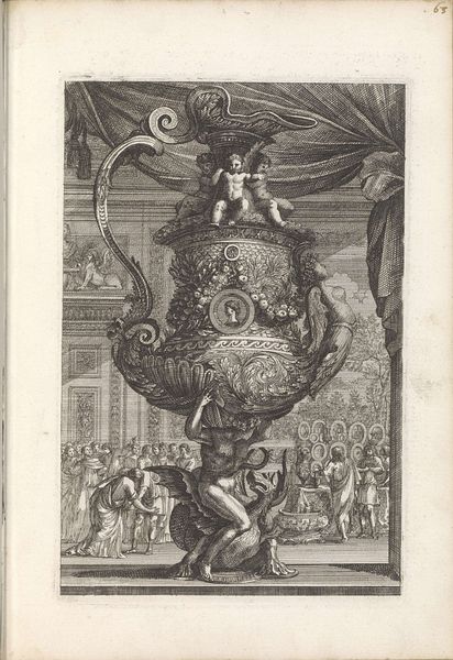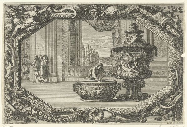 This engraving by Jean Lepautre presents a decorative fountain, teeming with symbolic meaning characteristic of its time. Nymphs, cherubs, and satyrs adorn the frame and fountain, evoking a sense of classical mythology and a connection to the natural world. The figures of Atlas supporting the vase remind us of the enduring fascination with classical antiquity, which experienced a resurgence during the Renaissance and Baroque periods. Yet, these motifs are not mere replicas of the past. They are reinterpreted, infused with new meanings relevant to the cultural and social contexts of the 17th century. The cherubs, derived from pagan cupids, appear frequently in Christian art, becoming symbols of divine love. Note how the motif of the satyr, a symbol of untamed nature, can be traced back to ancient Greece, often associated with Dionysian revelry and uninhibited expression. The depiction of water spouting from the fountain, too, holds significance. Water, a symbol of purification, renewal, and life, has been a potent symbol across cultures and throughout history. As we observe these symbols, consider how they engage our collective memory, triggering subconscious associations and emotions. The non-linear, cyclical progression of these symbols reveals how they resurface, evolve, and take on new meanings.