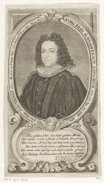 Johann Georg Beck’s “Portret van Wolfgang Melchior Stisser” is an engraving, printed on paper. Engraving is a labor-intensive intaglio process, where the artist meticulously cuts lines into a metal plate, which is then inked and pressed onto paper. The crisp, precise lines of the portrait speak to Beck's skill with the burin, the specialized tool used for engraving. The textures of the face, the elaborate wig, and the sitter’s clerical robes are all evoked through careful control of line weight and density. The social context of the work is also apparent. This print would have been made in multiples and circulated, thereby publicizing Stisser’s image and accomplishments. The very act of creating and distributing such an image underscores the cultural importance of portraiture as a tool for establishing identity and projecting power. Ultimately, the meaning of this work lies not only in its aesthetic qualities but also in the processes of its making and its role within a wider system of social and economic exchange.