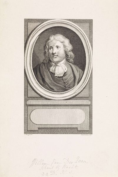 Curator: Looking at this engraving by Reinier Vinkeles from 1789, “Portret van Nicolaas Heinsius,” my first thought is how incredibly composed it is, this man framed within frames. Editor: It strikes me as almost mournful. The grey scale creates a stark contrast, emphasizing the somberness of the sitter's expression. It is more than a likeness, isn’t it? A window to a world gone by? Curator: Absolutely. Heinsius, as you can guess, was an important scholar. But let us not pass over Vinkeles’ skill. Engravings such as this served a vital role. It acted almost like social media today. Before photography, it distributed imagery that carried so much weight in political and intellectual circles. Consider the very Baroque cascade of his hair, meticulously rendered in line. Editor: And that ruffled collar, such an overt symbol of status! Though somewhat muted in the grayscale print, these elements surely resonated deeply with the social structures of the era, marking Heinsius as an emblem of the scholarly elite. One wonders how his contemporaries perceived such deliberate displays of status. Did it reinforce social cohesion or breed resentment? Curator: Very complex, of course. It solidifies not only status but an aspirational identity tied to learning and power, particularly for an expanding literate class. We look back and sometimes simplify, but images like this were very powerful cultural objects in circulation. Engravings reproduced existing works of art or famous men so these would live on beyond a canvas accessible only to some. Editor: It's intriguing how the visual language of power remains so consistent. The carefully constructed image— the portrait, in this case— used to project an aura of authority. We've simply adapted our methods in the age of digital media. Curator: Right, exactly. Symbols shift and mutate, but the underlying psychological principles— the need for leaders, for idols—these endure. It’s why images continue to have power, to move and control. It makes you wonder, looking back, what meanings will future viewers attribute to our own art? Editor: Indeed, a fitting question on which to end our contemplation here.