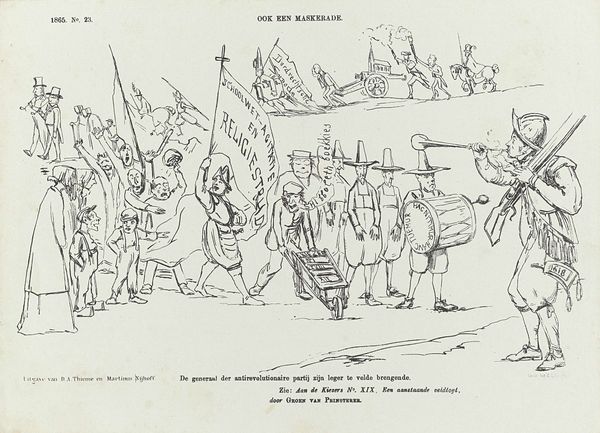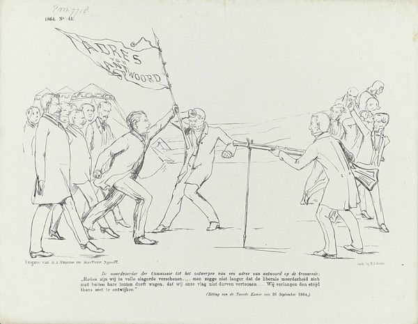This is Johan Michaël Schmidt Crans’s "Political cartoon on voters and candidates", made in 1862. The Dutch political landscape of the mid-19th century was marked by debates over constitutional reform and electoral processes, which provided fertile ground for satirical commentary. The print depicts a crowd of men, presumably voters and candidates, in a state of disarray. Some carry banners with conflicting slogans like "Order without Freedom" and "Freedom without Order," capturing the ideological clashes of the time. The phrase "Law in reverse" gives us a feeling of regression and backwardness. The artist cleverly uses visual metaphor to critique the political climate. Schmidt Crans comments on the complexities and contradictions inherent in the electoral process, offering a glimpse into the anxieties and aspirations of Dutch society during a period of political change. The cartoon reflects the emotional and personal dimensions of political engagement and the ongoing struggle to reconcile conflicting values in the pursuit of progress.