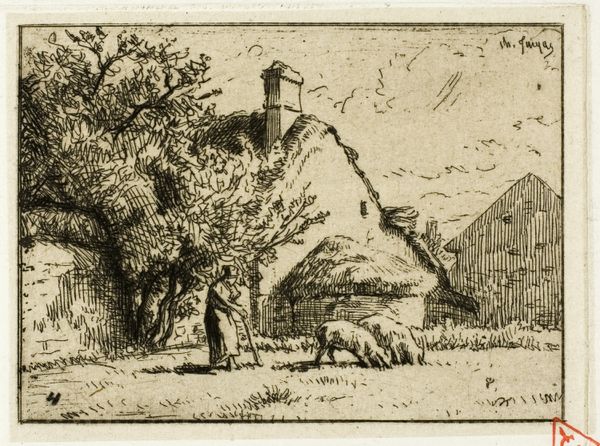 Curator: This print, "Women Hanging Clothes," was created by Ferdinand Kobell, a German artist who lived from 1740 to 1799. It’s currently held at the Harvard Art Museums. Editor: My first impression is of a very ordered, almost stoic rural scene. The lines are so precise, giving it a sense of cool detachment, despite the everyday activity depicted. Curator: The scene, rendered through delicate etching, certainly reflects a specific moment in time, and the timelessness of domestic labor. The women, almost dwarfed by the house and trees, are a recurring motif. Editor: I’m curious about that juxtaposition—the monumentality of the architecture against the almost anonymous figures. It speaks to the structures, both physical and societal, that frame women’s lives and work. Curator: Indeed, the visual weight given to the home reflects the symbolic weight of the domestic sphere, which held so much cultural meaning. The women hanging clothes, an activity performed out in the open, carries a whole range of social and economic connotations. Editor: Yes, it makes me consider how this seemingly simple act can be read as a symbol of community, labor, and visibility – or the lack thereof – within the broader societal landscape. It definitely underscores the importance of looking at art within its historical and social frameworks. Curator: I agree. It’s fascinating how an image of such everyday life can offer a window into deeper meanings and cultural narratives. Editor: Absolutely, this print has given me a lot to consider about the intersection of women, work, and representation.