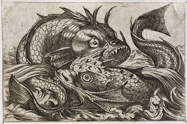 Antonio Tempesta created this etching of two fighting fish, sometime between 1570 and 1630. During this period, the rise of printmaking allowed for the wide circulation of images, and Tempesta was particularly known for his battle scenes and animal combat depictions. But we should ask: what exactly was the role of these images at that time? Looking at the cultural context of 16th and 17th century Europe, we see a society undergoing rapid changes, marked by religious conflicts, and a growing interest in natural history. Prints like these served not only as entertainment but also as sources of information and moral lessons. The ferocity of the fighting fish, rendered with meticulous detail, might reflect the turbulent political climate. It also speaks to the early modern fascination with the natural world, feeding into a broader cultural interest in exploration and scientific inquiry. Historians of the era consider such prints within the context of the print market, the development of scientific illustration, and the patronage of art by both religious and secular institutions. They reveal much about the values and anxieties of their time.