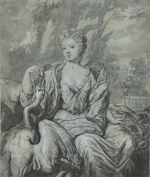 Curator: This monochrome piece immediately strikes me as wistful. There's a gentleness in the rendering, a quiet reverence. Editor: Indeed. We are looking at Willem van Mieris's "The Goddess Ceres," created in 1719. It's an oil on canvas currently housed at the SMK, the National Gallery of Denmark. A beautiful, if somewhat restrained, example of Baroque allegory. Curator: Restrained is a good word. Considering it’s a goddess, there's an intimacy, almost a melancholy to it, isn't there? She’s draped, but her shoulder is bare. It makes her relatable, less Olympian somehow. I wonder what van Mieris was thinking. Editor: I see it less as melancholy and more as a strategic deployment of modesty. Remember the context—the rise of Enlightenment ideals, a critique of excessive Baroque opulence. Ceres, the goddess of agriculture, fertility, and harvest, embodies not just abundance, but also civic responsibility and a connection to the land, far from decadent aristocratic displays. Her gaze is downcast, perhaps reflecting a humble acknowledgement of nature’s power. Curator: That’s interesting. I was seeing her detachment as dreamy, almost a secret sadness—the wheat she holds looks weighty, maybe a symbol of burdens as much as blessings. Editor: Absolutely, the wheat is key. As an activist, I’m drawn to considering how the harvest is portrayed. Who benefits from Ceres' bounty? Were the laborers and enslaved people who cultivated the fields ever represented with such… idealized softness? This image operates within very specific power dynamics of its time. Curator: That is true and I was being a tad romantic, lost in the tones, the flowing cloth and wheat! Editor: That is a feeling, a reading. And perhaps that's its own truth: this black and white baroque allegory still stirs, challenges, and makes us want to keep searching the horizon. Curator: Maybe it reminds us that what's beautiful isn't always simple. We are looking at this portrait with our contemporary lens, searching it with both head and heart. It is quite captivating, isn’t it?