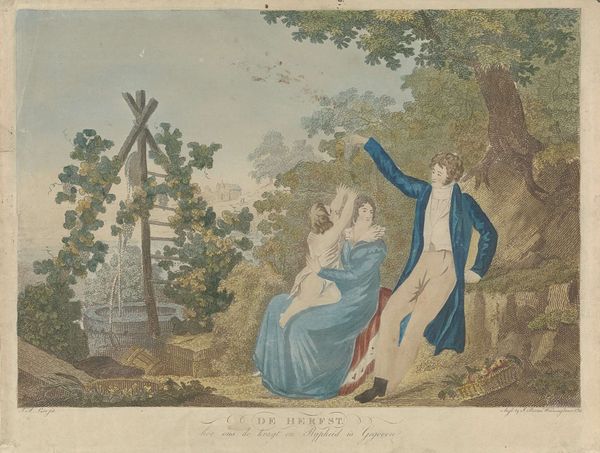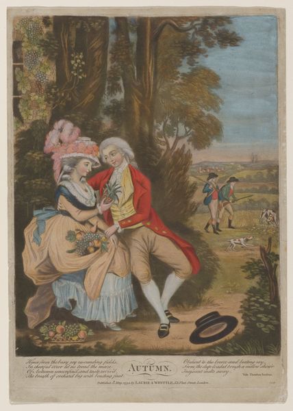 This print, titled "Spring," was made with etching and engraving, common techniques in the 18th century. An anonymous artist would have used sharp tools to incise lines into a metal plate, creating a design, which was then inked and printed onto paper. This reproductive medium allowed for the wide dissemination of imagery, a direct result of industrialized print production. Look closely, and you’ll see how the delicate, linear quality of the engraved lines defines the figures and landscape. The texture and weight of the paper, combined with the layering of ink, would have influenced the print’s final appearance, giving depth to the pastoral scene of courtship and leisure. The print suggests a particular vision of society, where the labor of producing images could also reinforce ideas about class, taste, and beauty. The production of prints contributed to consumer culture, providing access to art and design for a broader audience, yet also shaping and reinforcing social hierarchies through its imagery.