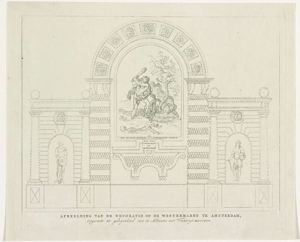Curator: It has such a melancholic atmosphere. Almost gothic. Do you agree? Editor: That’s a fitting response. What we have here is an engraving, titled “Grafmonument van Duco Martena vna Burmania en zijn vrouw,” dating from 1871-1875. It's currently held at the Rijksmuseum. It appears to be after an older design. The artist is Andries van Calfsbeek, according to our records. Curator: The old engraving style makes it appear much older. The skulls definitely contribute to that gothic feeling. Skulls and crossed bones seem a little bit heavy handed perhaps? Editor: In the context of the time period in question, it serves a stark reminder of mortality and the weight of familial legacy. Notice how it portrays a detailed tomb monument; you can almost see it in three dimensions. Think about how families memorialized themselves through these sorts of works. The text included celebrates lineage. Curator: And those heraldic shields on either side. They speak volumes, don’t they? They present this narrative of family history and power structures that defined individuals' places within society. I think the cherubs up top, while conventional for these types of memorial pieces, seem a bit at odds with the skulls at the bottom. Editor: An interesting juxtaposition! Perhaps speaking to different levels of existence, one more earthly, the other more divine. Do you think it effectively represents the weight and social currency that family name held during that period? Is it more than just pretty heraldry? Curator: Absolutely, I think that the choice of engraving—reproducing or imitating older designs, perhaps—suggests an intention to imbue the Martena and Burmania families with the gravitas and respectability conferred by history. The style recalls, possibly intentionally, the Mannerist style, another nod to their prominent past. Editor: Seeing this from a 21st-century perspective makes one wonder how individuals navigate their identities today, in contrast to when legacy and lineage were more pronounced determinants. How much choice do we have now? Curator: That’s an important reflection. Perhaps this work is then an interesting intersection between then and now, and where, in that equation, we are all positioned in the twenty first century. Editor: Indeed. It prompts important discussions about remembrance, legacy, and social identity.