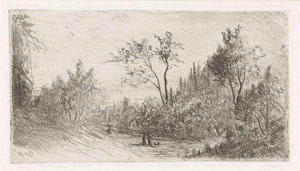 Curator: Look at this intriguing artwork—"Group of Trees" crafted by Camille Corot in 1858. It’s rendered in pencil and etching. What's your immediate take? Editor: Ah, Corot. My first thought? Whispers. The whole scene feels like it’s breathing secrets into the wind. It's like a landscape woven from delicate, almost shivering, lines. Curator: Indeed. It’s fascinating how Corot leverages accessible materials—pencil and etching—to evoke a particular vision of nature in a very industrial age. Consider the rise of mass-produced paper coinciding with Romantic ideals... Editor: I see a kind of restless melancholy. The way the light flickers through the branches. It’s like capturing a feeling, rather than simply depicting trees, isn’t it? Gives me the sensation that time is always in motion... Curator: Precisely, capturing that fleeting quality involves technique, sure, but also connects deeply to the broader Romantic movement rejecting Enlightenment rationalism. The repetitive etching mimics textures and movement... What were Corot's relationships to the paper making and printing industries in that era? Editor: And what about those solitary figures way off in the distance there? The tiny humans really anchor you. Without them, the drawing could become pure abstraction... You know? Like some sort of atmospheric sketch of an internal emotion. They kind of pull you back to the earthly plane. Curator: Well, their inclusion creates tension with nature's overwhelming presence in the Romantic era. The people remind us of labor's impact on this landscape. It could suggest industrialism versus pastoral ideals... Editor: Okay. I like the idea. Curator: We could continue with that... Any other overall reactions now? Editor: This piece gets under my skin, it feels... timeless and raw at once. Now that I've seen it more closely. So delicate but forceful! What about you? Curator: Indeed, contemplating the interaction of natural materials with burgeoning industrial means grants us invaluable perspectives. The trees speak volumes!