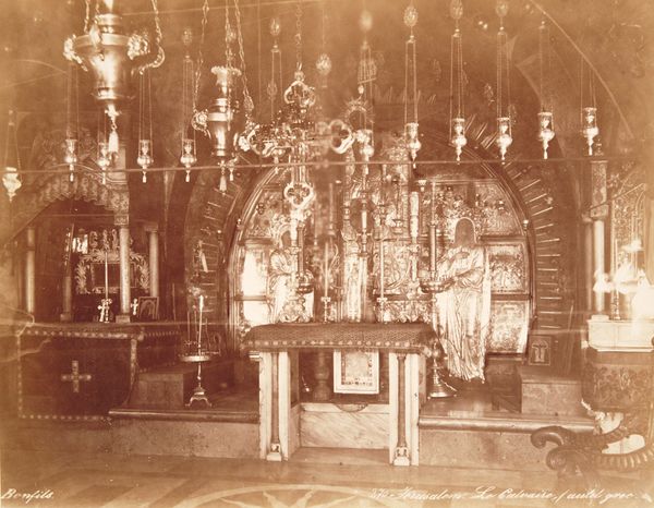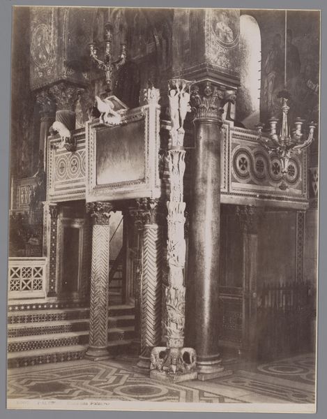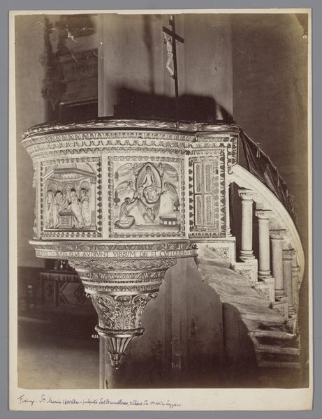 This albumen print shows the pulpit in the Pisa Baptistery, and was created by Giorgio Sommer sometime in the mid-19th century. Sommer, a German photographer based in Italy, captured cultural landmarks, feeding into European desires for exotic travel imagery. Sommer's work intersects with the burgeoning tourist industry and the colonial gaze of the 19th century. The photograph aestheticizes the pulpit while maintaining a distance, reducing the complexities of religious and cultural identity to a picturesque scene. The pulpit itself, with its elaborate carvings and biblical scenes, speaks to the power and authority of the church, but Sommer's lens transforms it into a commodity, stripped of its original spiritual context. What do we make of how faith, art, and commerce intertwine and shape our understanding of cultural heritage? How does Sommer, as a foreigner, mediate our encounter with this sacred space?