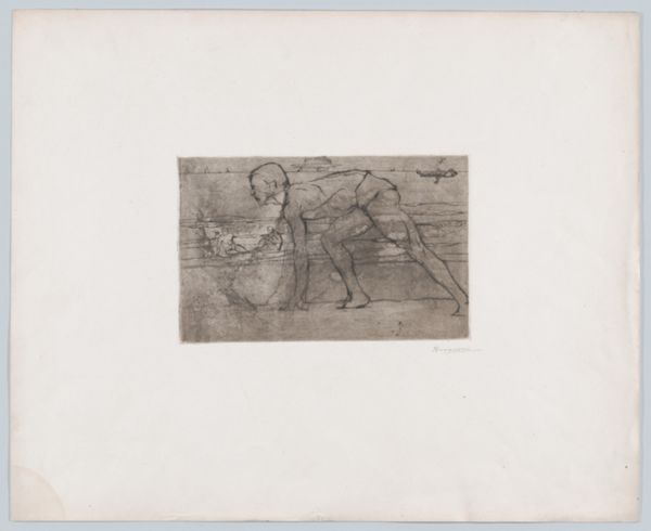 This is Eugène Verboeckhoven’s etching, “Head of cattle and a calf”. Here, we are presented with a study in monochrome that focuses on the textures and forms of rural life. The composition is deceptively simple, dominated by the heads of the animals, yet it’s the artist’s command of line and tone that truly captivates. Verboeckhoven masterfully uses etching to create a contrast between the rough textures of the cows' coats and the smoother, almost ethereal quality of the surrounding landscape. This contrast draws our attention to the materiality of the animals, grounding them in a very real, tangible world. Observe how the play of light and shadow defines the musculature and bone structure of the cattle. The artist’s approach destabilizes the conventional hierarchy of artistic subjects, elevating these commonplace creatures to objects worthy of aesthetic contemplation. Ultimately, this artwork functions as a semiotic system where line and form combine to represent not just cattle, but a broader engagement with the values and aesthetics of rural life.