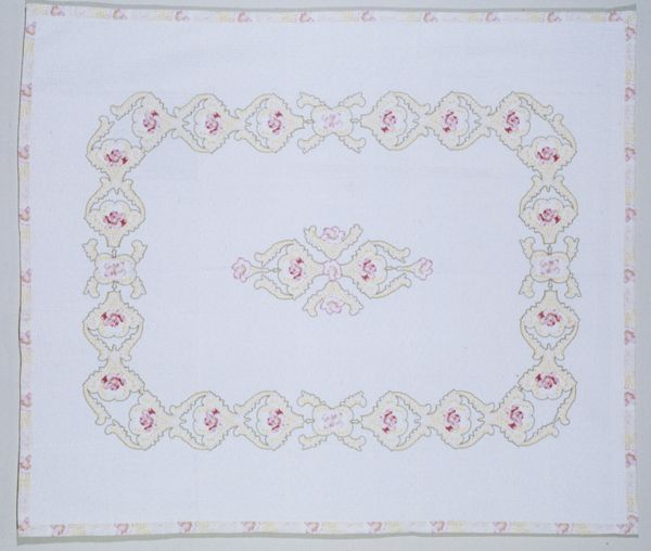 Editor: This is an intriguing piece called "Wedding Quilt," made around the 1930s from cotton textile. It's so delicate, and the repeating grid-like structure is really captivating. What do you see in this piece from a formalist perspective? Curator: The structural integrity is, indeed, immediately apparent. Observe how the artist establishes a dialogue between the central grid motif and the surrounding negative space, or ground. The geometry, rendered through careful textile arrangement, creates a visual rhythm. How does the quilting technique contribute to your understanding? Editor: I notice the way the fabric is stitched—it gives the piece a lovely, subtle texture that almost feels like it's breathing. It softens the harsh geometry of the grid. Is this play between structure and texture a common element in quilts of this period? Curator: The juxtaposition you've identified is critical. The structural organization, governed by repetition and geometric principles, is balanced by the inherent tactile quality of the material. Moreover, reflect upon the color palette. Its subtle variations enhance the depth and visual interest within the rigidly defined framework. How do you see these subdued hues functioning within the overall composition? Editor: I find the muted colors calming, like a whisper. They contrast the grid, but they soften it. They work together, so that each intensifies the other. Curator: Precisely. The artist exploits the inherent tension between these formal elements to establish a sophisticated visual discourse. The geometric exactitude establishes a powerful system that gains from the nuanced effect produced by a specific selection of materials. Editor: That's a great reminder of how paying attention to both the big picture structure and the minute aspects, like texture, can reveal so much about a piece. Thanks for pointing out how it’s not just decorative but creates a meaningful impact on how we interpret the whole artwork. Curator: A careful parsing of a thing yields insights. Focusing on the formal aspects enriches appreciation.