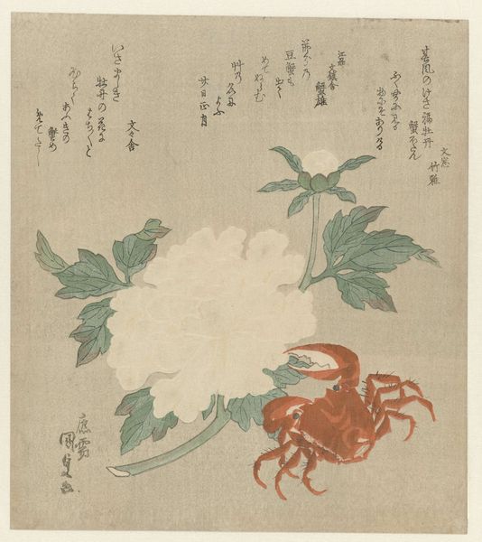 Curator: This is Sakuragawa Jihinari's "River Shrimp with Sake Cup," created in 1823, an intriguing work rendered in watercolor. Editor: Mmm, sparse but somehow abundant! It's like a haiku… visually a little melancholy, don't you think? Curator: The composition is deceptively simple. The crustacean and cup, placed asymmetrically, create a visual tension resolved by the calligraphic elements framing them. Note the meticulous detail in the shrimp’s anatomy, contrasted with the almost ethereal rendering of the sake cup. It reveals the interplay of precision and suggestion. Editor: Suggestion is key, right? The shrimp looks vulnerable, almost sacrificed for the sake…no pun intended! Its color against that plain ground speaks of…well, imminent demise. Does it feel celebratory to you? Curator: Celebration may not be the only element at play here. The formal qualities—the muted palette, the balance between detail and negative space—evoke a sense of ephemeral beauty characteristic of the ukiyo-e tradition. Each brushstroke communicates purpose. The shrimp becomes a semiotic emblem within a larger system of coded gestures. Editor: Right! But encoded gestures… for who, ultimately? You say emblems. I see symbols for things so human: transient joy, shared moments that exist… then vanish like the last drop of sake. Beautiful...bittersweet! Curator: Perhaps the painting is deliberately ambivalent, designed to stimulate varied personal interpretation while simultaneously existing as an aesthetic object worthy of analysis unto itself. Editor: Which is what makes it work, isn't it? Form, and feeling. Thought and emotion entangled so neatly. I'm left pondering the unseen story behind the meal, and it all seems delicately balanced. Curator: A delicate balance captured expertly. An evocative synthesis of image and intention indeed.