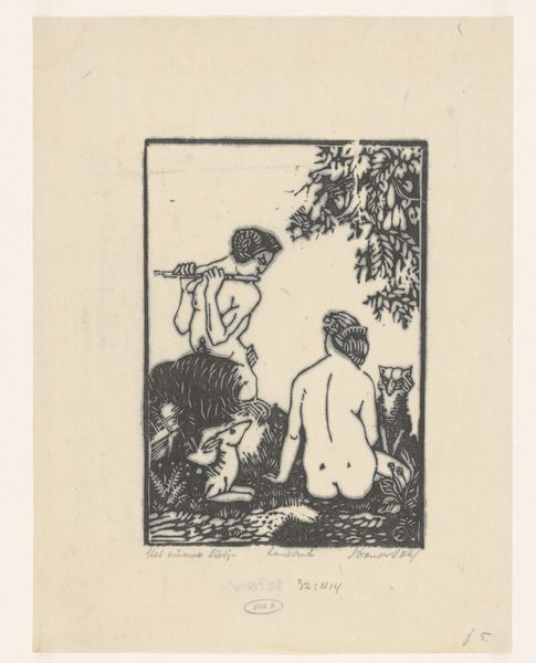 Curator: Looking at Otto Mueller’s ink drawing from 1917, titled “Standing Boy and Two Girls”, the first thing that strikes me is its somewhat melancholic stillness. It’s as if we’ve stumbled upon a private, silent gathering. Editor: Absolutely. The sparseness of the ink drawing contributes to that feeling. The lines are so economical, yet they convey form and emotion effectively. I can sense a sort of primal innocence but also the looming shadow of Expressionism. Curator: Indeed. Mueller's involvement with Die Brücke is important to understand. Their commitment to challenging bourgeois values resonates strongly here. Nudity became a form of social critique, a return to nature and a rejection of restrictive societal norms. The figures seem almost lost within a landscape that both protects and confines them. Editor: And the landscape itself is intriguing, the simple rolling hills could almost echo the figures' own contours, like a shared silent rhythm. Note the stylized forms of the children, almost as if they are reduced to archetypes of youth and the collective memory of pastoral refuge. Curator: The positioning of the figures feels purposeful too. The standing boy, acting almost as a boundary with the world, looks off to some vague point on the horizon. There is one figure crouched away from him in shadow. What relationship is implied by these arrangements? Editor: One could argue the boy in the center, the more overtly masculine one, serves as a symbol of adolescent awareness, framed by the natural world and perhaps wrestling with his own selfhood. This could be about transitions. Curator: It's worth considering that this piece was created during the First World War. Mueller, while initially a volunteer, was later deemed unfit for service. Does the drawing present an idealized retreat away from conflict, or is it haunted by an underlying sense of disruption? Editor: Perhaps a yearning for a prelapsarian idyll? This does seem more inward-looking and dream-like than an outward-facing statement. It’s as if these children inhabit a liminal space, caught between innocence and a looming reality. Thank you, this was interesting. Curator: Yes, this image is indeed an invitation to look deeper than surface representation, considering both intimate feeling and broader societal concerns. A complex tension in a simple, subtle package.