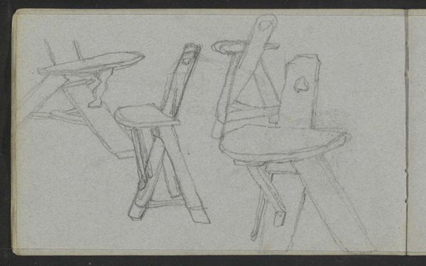 This is 'Two Chairs', a sketch by Carel Adolph Lion Cachet. At first glance, the composition is simple: two chair outlines sketched in pencil on a creamy page. The chair on the left uses curved lines, and the chair on the right is defined by straight lines. The artist contrasts their forms and challenges our expectations of how furniture is represented. Cachet seems to be dissecting the very idea of a chair, reducing it to its most fundamental shape. We can interpret each chair as a sign. One chair has organic lines and feels inviting; it signifies comfort. The other chair employs a more rigid geometry, which signifies utility. These chairs do more than just depict furniture; they invite us to question how we perceive the function of everyday objects. Consider how these lines engage with broader themes of form and function, challenging fixed meanings and engaging with new ways of thinking about representation.