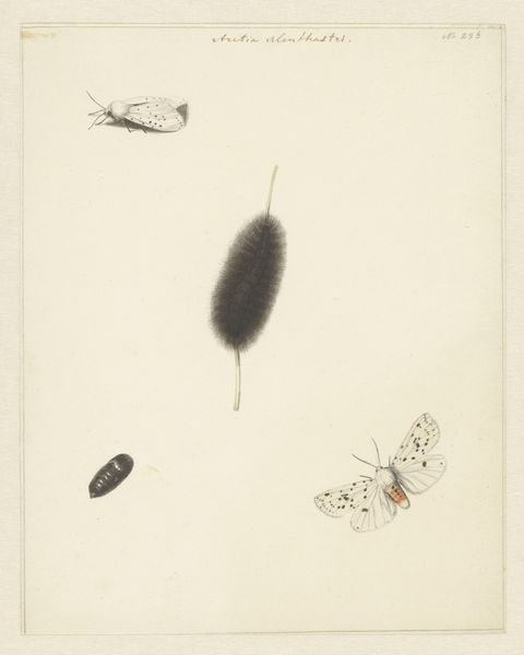 Nicolaas Struyk created "A Caterpillar and Two Moths on a Branch and Two Butterflies" using watercolor and graphite. The composition is striking for its seemingly casual arrangement against a light background. The forms—caterpillar, moths, butterflies, and branch—are meticulously rendered, yet the overall effect is one of lightness and ephemerality. Struyk masterfully employs line and color to distinguish each creature, using fine lines to define the delicate wings of the moths and bolder strokes to delineate the caterpillar's form. Structurally, the branch serves as a compositional anchor, but its diagonal placement introduces a dynamic tension, further enhanced by the insects scattered across the picture plane. This arrangement plays with our understanding of space and form, blurring the lines between scientific illustration and artistic expression. Consider how the apparent randomness destabilizes traditional notions of order and symmetry, inviting us to reconsider our relationship with the natural world. The artwork becomes a stage where nature's actors perform in an open-ended tableau, inviting multiple interpretations and engaging with broader ideas about transformation and perception.