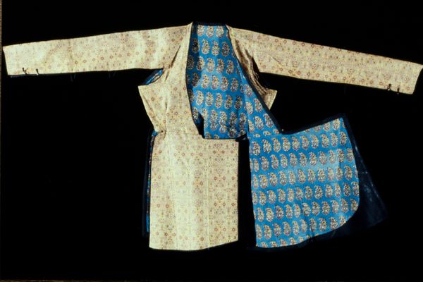 Curator: Let’s consider this woman's caftan from the 19th century, currently housed at the Minneapolis Institute of Art. These garments tell us so much about trade, class, and the visual culture of their time. Editor: My initial reaction is that it appears both comforting and dignified, almost like a portable sanctuary. I immediately think about the tactile experience of wearing such a hand-embroidered garment. Curator: Indeed. The hand embroidery itself is an interesting detail. Such garments served not just a functional role but also as expressions of status and artistic identity. Depending on its provenance, certain stitching patterns and fabrics may have been encouraged and emulated more in certain locales than in others. Editor: I find the lines particularly striking – they almost create a visual language. Repetition evokes reliability and adherence to pattern. Curator: Patterns, absolutely. If we knew where the piece was made, we might have clues. Certain colors or patterns had symbolic meanings, reflecting beliefs about protection or well-being. More generally, clothing broadcasts wealth, access to goods, and possibly ethnic identity within certain colonial or semi-colonial contexts. Editor: Considering the scale, too; you get the impression of something almost enveloping, hinting at hidden stories or rites of passage embedded in everyday life. Does its wear and tear tell a story of changing ownership, or fluctuating value? Curator: Potentially! Textiles have a biography beyond their aesthetic function. They’re barometers of the social landscape in which they exist. Looking at how garments are collected and displayed today in museums—or their representation within popular media—is part of an ongoing political dialogue about cultural heritage. Editor: I completely agree. By focusing on craftsmanship and social practice we keep these textiles alive; otherwise, garments would sit silent in the archive! Curator: That's right. Understanding objects such as this involves weaving together threads of history, artistry, and cultural significance. Editor: Precisely! Looking closely connects us with a time and culture. That, perhaps, is the lasting power of textiles.