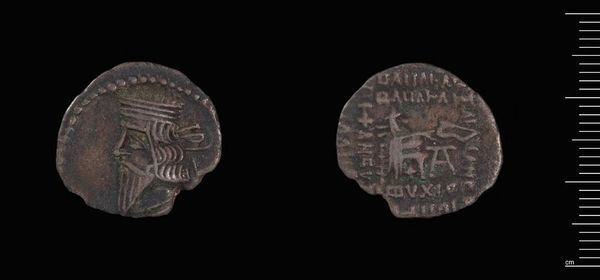 Curator: This is a Drachm of Orodes II of Parthia, likely minted in Ecbatana. It weighs just under four grams. Editor: It feels incredibly weighty, doesn't it? All that history pressed into such a small, unassuming object. The king’s profile seems severe, almost burdened. Curator: The image of Orodes II was certainly intended to project power and authority. Coins like this were important tools in consolidating his rule. Editor: Absolutely, and the symbolism on the reverse, though worn, hints at the religious and cultural influences at play in Parthia at the time. Curator: Precisely, images on coins provided an important cultural and political message. Editor: Examining these objects offers a fascinating glimpse into how rulers crafted their public images and how empires communicated with their people. Curator: Yes, it’s a window into the past, revealing political and social dynamics.