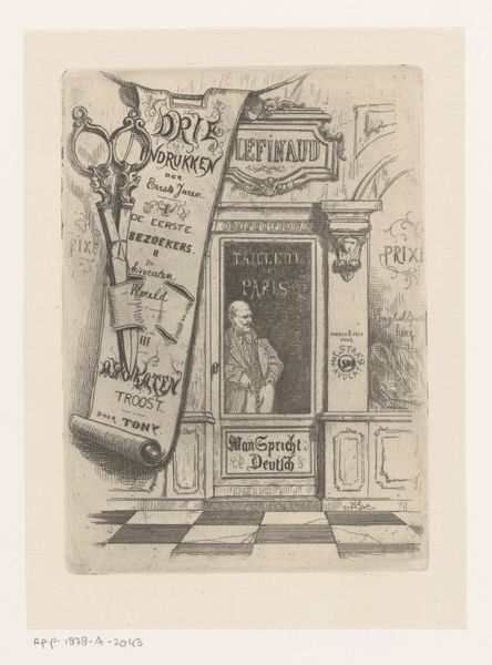 Editor: Here we have an engraving titled "Etalage van prentverkoper en uitgever John Redington te Londen," made around 1880 to 1937 by an anonymous artist. It depicts the storefront of a printer and bookseller, teeming with details. It really gives me the feeling of bustling London life at the time. What stands out to you in this print? Curator: As a materialist, my gaze is drawn to the conditions of its production. Look at the details! The engraving itself speaks of a laborious process, requiring skill and time. Each line etched into the plate, each character of text, tells a story about the artisan and the availability of printed materials to a burgeoning reading public. How do you think the method used for reproduction of prints like this changed art itself? Editor: Well, more people could have access to these images than to original paintings, so I guess that could democratize art appreciation somehow? I do think that this commercial aspect of the piece and all of those available titles that people could buy makes art less elite. Is this related to the rise of a middle class, maybe? Curator: Precisely. The print's subject matter, a shop, underscores the emerging culture of consumption. It also dissolves traditional distinctions: printmaking often considered 'craft' becomes a vehicle for history and 'high art' reproduction. The materials – paper, ink, the metal plate – and the means of distribution were crucial to how people understood art and information. The very act of purchasing prints democratized the means of production and access to art. The piece really raises questions on labor and consumerism. Editor: It’s interesting to think about how a simple print can reflect so much about the society that created it and the labour that sustains artistic production! Thanks! Curator: Absolutely. By focusing on the materials and methods, we reveal the social forces at play. Thanks for prompting me to think through all this once more.