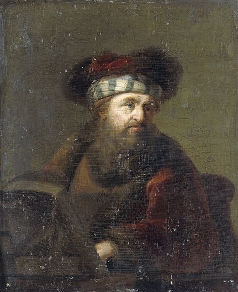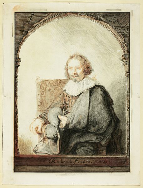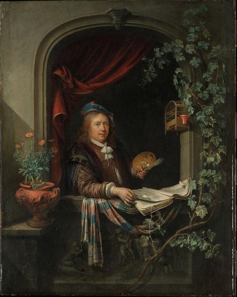 Curator: This is Godfried Schalcken's "Portrait of an Artist in His Studio," likely painted between 1670 and 1675. It's currently housed in the Städel Museum. What are your initial thoughts? Editor: Morbid, isn't it? A bit like peering into someone's existential crisis. That skull feels heavy, both literally and figuratively. Curator: Schalcken's skill is evident in the contrasting textures. Observe the smoothness of the sculpted figure against the rough surface of the skull and the aging skin of the artist. The labor in producing those very distinct materials is central to the painting's concept. Editor: Absolutely. And it invites questions about the construction of masculinity, too. This artist, surrounded by symbols of mortality and idealized beauty, projects a carefully constructed image. It suggests the art world of the time had deeply embedded biases of its own about gender and production. Curator: The subject matter touches on the classic vanitas theme. Mortality and the ephemeral nature of life and art. Note how he incorporates painting and sculpture as symbolic pieces, questioning which material holds more value. Editor: Right. It seems like he's staging a commentary on art and history in relation to temporality. Also, thinking about social history, the artist's gaze directed towards us also invites a sort of consideration on wealth, power, and self-regard during the Dutch Golden Age. Curator: Indeed. These intimate studio portraits, they also function as marketing materials, as tools for reputation construction, indicating how vital skill was for generating income and establishing position. Editor: So this work isn't just about life and death but really about the artist's own ambition, framed within social realities, right? It all underscores how intertwined personal identity, artistic endeavor, and social capital were then—and continue to be. Curator: It gives us plenty to ponder as we observe this remarkable piece. Editor: Absolutely. This little window into a 17th-century artist’s studio gives a lot to consider. Thanks.
