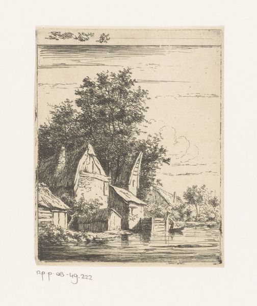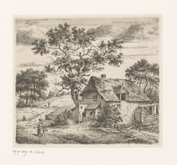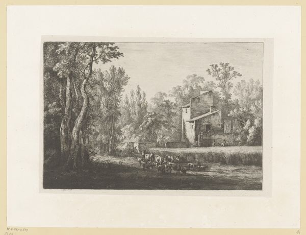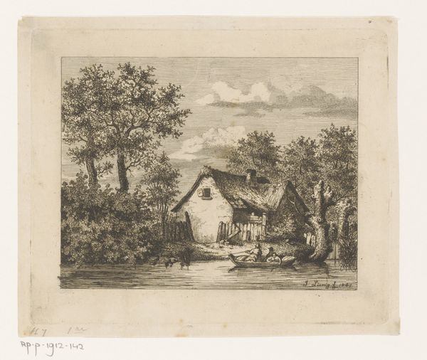 Jean Théodore Joseph Linnig created this etching, "Rowboat on a River in front of a Farm in Wetteren," in 1841, capturing a serene moment of rural life. The image invites us to consider the intersections of labor, leisure, and landscape in 19th-century Belgium. With a keen eye, Linnig portrays figures taking respite in a boat, contrasting them with the agrarian setting that underscores a society deeply rooted in its connection to the land. The labor of farming and the leisure of a boat ride become intertwined, revealing a complex relationship between humans and their environment. How does the idyllic scenery serve to either highlight or perhaps obscure the realities of rural life and labor? The careful detail in both the natural elements and the human figures encourages us to reflect on the social dynamics, asking whose stories are prioritized in images of pastoral life, and whose are left untold. Ultimately, this etching not only depicts a scene but also prompts us to contemplate the historical and social contexts that shape our understanding of labor, leisure, and the natural world.
