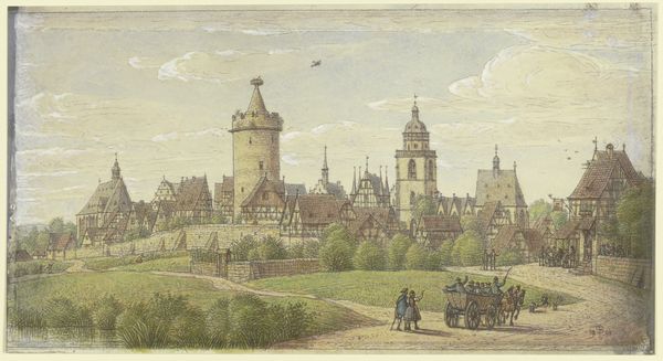 Peter Becker’s ‘Camberg in the green valley’ captures a serene landscape through delicate lines and muted colors. The composition, structured around the prominent tower, draws our eye upwards while the surrounding buildings nestle harmoniously within the valley. The artist employs a structured approach, dividing the scene into distinct planes. Notice the detailed rendering of architectural forms against the softer, more textured rendering of the natural elements. This juxtaposition invites us to consider the interplay between human construction and the organic world. The linear precision defining the buildings contrasts with the blurred lines of foliage, a dance between control and freedom, order and chaos. Becker’s strategic arrangement of elements and the subtle shifts in tone suggest a deeper exploration of perspective and spatial relations. The work isn’t just a record of a place; it’s an essay on how we perceive and structure our environments. The detailed rendering encourages us to contemplate how we impose order on the natural world through art.