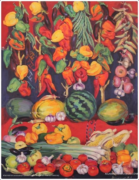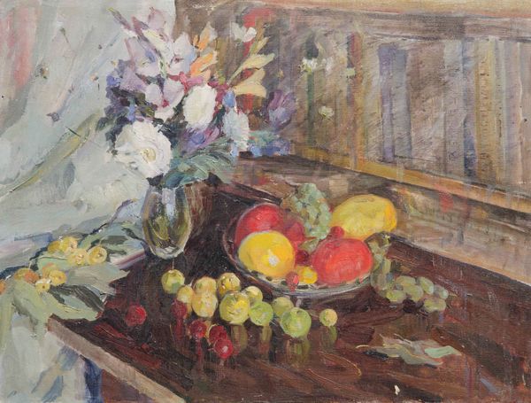 Barbara Elisabeth van Houten created this watercolor still life of pumpkins and grapes on a cloth, and you are immediately drawn into a world of vibrant, organic forms set against a complex patterned backdrop. The artist masterfully uses color and light to model the spherical shapes of the gourds, giving them a tactile presence. Notice how the dabs of pigment create a lively surface texture, with the rough skin of the pumpkins contrasting with the smooth, translucent grapes. The composition itself is intriguing; Van Houten arranges the objects in a seemingly casual manner, yet each element is carefully placed to balance color and form. One might consider the influence of Post-Impressionism, particularly in the way Van Houten breaks down natural forms into discrete brushstrokes, creating a scene that is both representational and abstract. Through her technique, the artist transforms everyday objects into a study of color, texture, and light, challenging our perception.