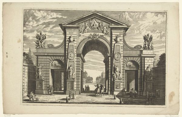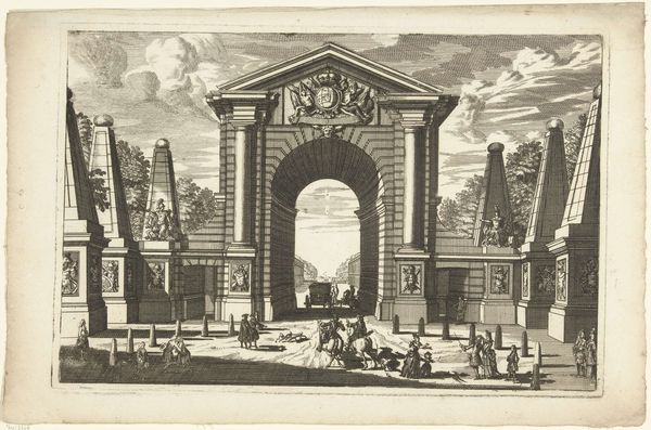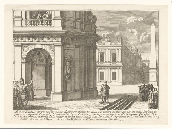 Curator: This is Henri Mauperché's "The Prodigal Son Wastes His Fortune." The etching, now housed at the Harvard Art Museums, illustrates a well-known parable. Editor: It’s all happening in front of this ridiculously opulent architectural structure. I wonder, does the artist feel a little conflicted about portraying such extravagance? Curator: It certainly places the biblical narrative within a specific cultural context, reflecting the lavish tastes of the 17th century. The architecture overwhelms the figures. Editor: Yes, and the figures become almost incidental—absorbed into the excesses, with the architecture taking center stage. It's kind of a cautionary tale, isn't it? The building is a very loud warning. Curator: Exactly, and the setting provides commentary on the social implications of wealth and the ephemeral nature of earthly pleasures. Perhaps more subtle than a sermon, but just as resonant. Editor: Well, the opulence screams so loudly that the message is clear. It makes you wonder if the prodigal son ever stood a chance in this environment!