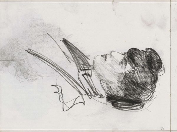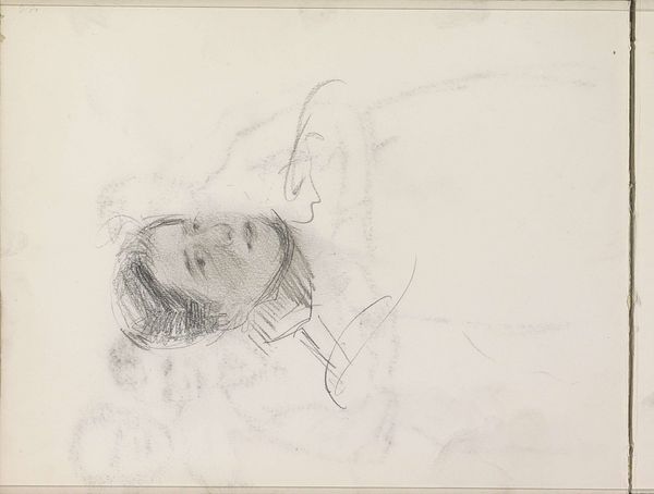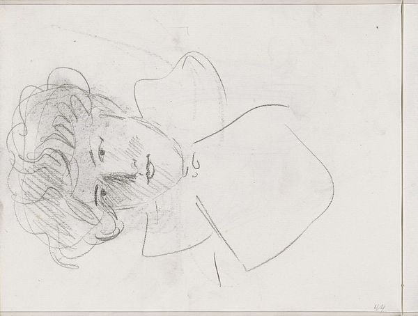 Curator: Here we have a pencil drawing, simply titled "Vrouwenhoofd," or "Head of a Woman" by Isaac Israels, thought to have been created sometime between 1875 and 1934. Editor: It feels very immediate, doesn't it? Almost like a fleeting impression captured right on the page. The loose lines give it such a sense of movement, as though she's about to turn away. Curator: That immediacy aligns perfectly with the social context Israels was operating within. He aimed to capture modern life and portray everyday moments. Israels was less concerned with academic polish than he was in capturing the essence of a moment, a feeling. Editor: Look at the contrast between the detailed rendering of her face and hair, compared to the vague, smudged background. It really brings her forward, emphasizes the texture of the paper itself. I'm curious, what pencils do you think he might have used, and where would he have bought them? I wonder if we have records about what artists in Amsterdam purchased at that time? Curator: Those details would certainly provide an even deeper insight, but his looser, sketch-like technique, evident in works like this, challenged traditional notions about the artist’s hand being precise. The unfinished aspect feels deliberate, doesn’t it? Editor: Absolutely. And it asks us to participate in the completion of the piece, in a way. We have to fill in the gaps, imagine the unseen. The paper and the quick work that emphasizes its raw surface becomes part of the meaning itself, almost collaborative, the artist and material, together. Curator: His place in the canon, however, was certainly affected by his own privileged position and the circles he mixed in, right? Access determined visibility. This sketch, because of the place Israels held within artistic society, is housed in the collection of the Rijksmuseum. The support structures are not equal for all. Editor: True. This drawing then becomes a complex negotiation—the immediacy and humble materials implying accessibility on one hand, while the institutional framing highlights inherent privilege in the art world. A powerful tension between process and access. Curator: Precisely. That duality allows the work to spark different conversations depending on where and how you choose to approach it. Editor: I'm going to be thinking about the pencil used to produce the image, and the artist's decision-making related to technique and material choice long after we leave this room.