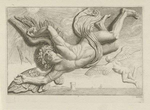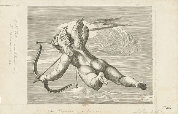 Pieter Romans created this etching, Putto schiet een pijl, in 1830. The image is made entirely of lines, cut into a metal plate and then printed onto paper. The etcher's craft results in an image with a very particular kind of presence. The lines are not just descriptive; they are almost like a tangible substance. Look closely, and you will see the marks vary in thickness and depth, creating areas of light and shadow that define the putto's form. These decisions reflect the artist's sensitivity to the material and its potential. This process required skill, patience, and a deep understanding of the etcher's tools. Romans' choice of etching as a medium is itself significant, suggesting an interest in making a traditional subject matter accessible through reproducible means. As such, the art is directly tied to broader issues of labor, craft, and cultural dissemination. Understanding the work involved, it's impossible to see this image as just a pretty picture. It is a testament to the artist's labor and the enduring power of materials.