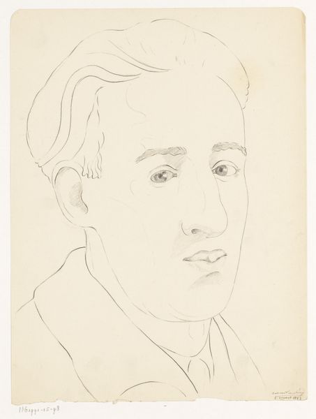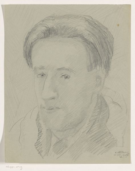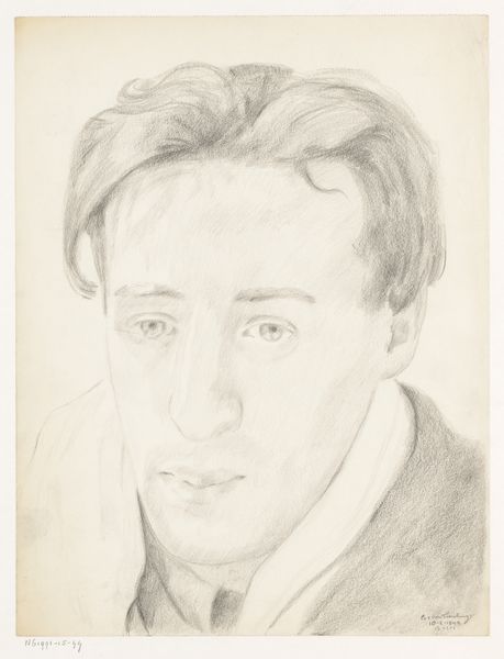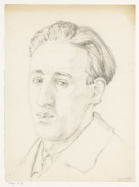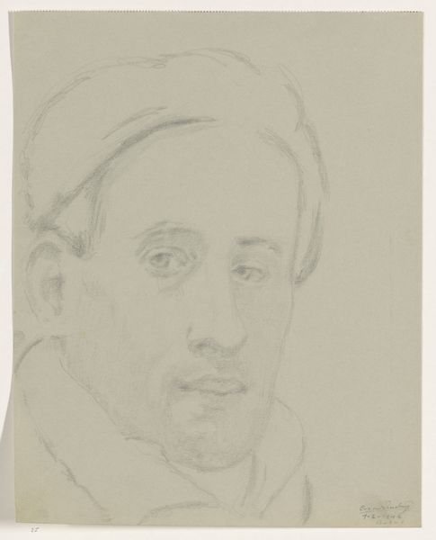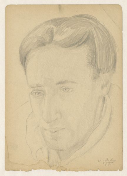Curator: Right, let’s turn our attention to this delicate drawing: "Zelfportret: B-1-1, 2 februari," which roughly translates to "Self-Portrait: B-1-1, February 2nd.” It’s believed to be a self-portrait by Cor van Teeseling, potentially from 1942, rendered in pencil on paper. It’s now part of the Rijksmuseum collection. Editor: It has this… fleeting, melancholic quality. All those soft pencil strokes almost dissolve before your eyes, as if the man in the drawing is fading away. Curator: Yes, the sketch-like quality invites contemplation. The artist’s gaze is introspective, carrying an emotional weight that the light pencil work doesn't quite diminish. This kind of expression goes back centuries. The symbols of an image can also reflect something about a society’s inner state, the collective psyche. Editor: Definitely a personal statement rather than a record of the likeness. And it feels like that raw vulnerability, that openness is intensified through the amateur rendering. What looks initially simple somehow conveys a very profound humanity. Like it captures not only physical likeness but this inner state. Curator: There’s a definite directness and vulnerability, you’re right. Consider, too, the possible date, 1942, smack in the middle of World War II. Self-portraits in such periods can become silent testimonies. Even if the intent was simply practice, it inherently reflects those strained, uneasy times. Editor: Oh, it’s difficult to not bring that knowledge into one’s reading, isn’t it? What does it mean to simply… exist… and capture that fleeting self, against the background of total catastrophe? Makes this feel not just poignant but deeply meaningful. Curator: Absolutely. These portraits become more than likenesses; they become documents, layered with cultural and historical meaning. It's not just the skill, it's also about understanding cultural memory and its place in these artifacts. Editor: I agree entirely. It reminds you that art, even a quiet pencil sketch, is almost always speaking of and to its own time. You almost get this impression the self-portrait wasn't complete and will eventually continue as the expression and self will become clear. Curator: Precisely. Thank you. An apt final word that allows each observer to see what could happen with an individual expression in society. Editor: Cheers. This will linger with me, it already is.