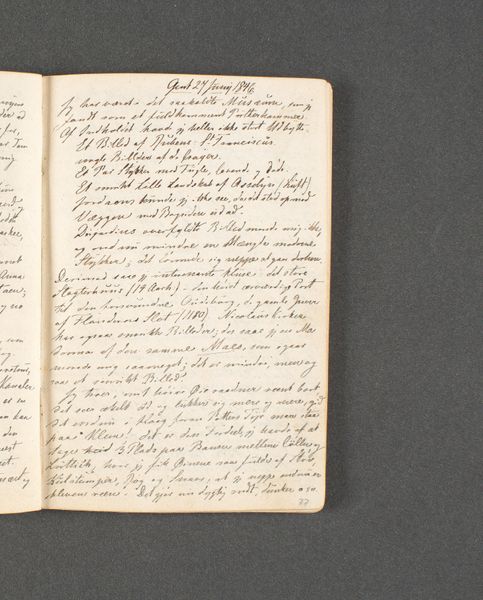Johan Thomas Lundbye created this travel journal page with ink on paper. The page offers a glimpse into the artist's personal reflections during his travels, connecting the physical journey with his artistic observations. Created in Denmark, around the 1840s, this work reflects the cultural value placed on travel as a means of education and inspiration. The act of keeping a journal was itself a cultivated practice, associated with intellectual and artistic development. Lundbye's notes and sketches reflect the romantic artistic movement of the time, with its emphasis on nature, personal experience, and emotion. Art historians might investigate the influence of travel on Lundbye's artistic development, cross-referencing his journal entries with his finished paintings and drawings. This journal reminds us that art is not made in a vacuum but is rooted in personal experience and shaped by cultural values.