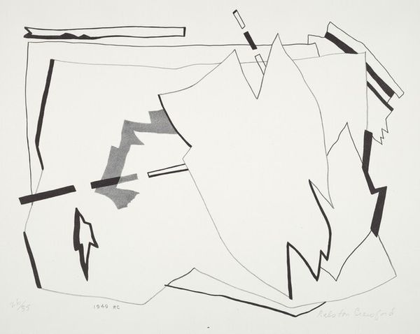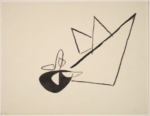 Curator: Standing before us is Alexander Calder's 1960 ink drawing, "Sketch after 'Four White Petals.'" The fluid lines suggest a quick study, capturing a sense of motion even within the still medium of ink on paper. Editor: My initial impression is one of playful simplicity. There’s something whimsical about the combination of sharp geometric shapes and the organic curves of what appears to be a stylized flower. It feels optimistic. Curator: Calder, of course, is renowned for his invention of the mobile. This sketch gives us a peek into the way he distilled forms, reduced objects to their essence before reimagining them in three-dimensional, kinetic sculptures. How might the broader politics of abstraction shape public perception, then and now? Editor: Right, I mean, it’s easy to read these shapes as purely formal elements, but considering the post-war context and Calder’s engagement with the avant-garde, abstraction was often a way to challenge established norms, offering a space for new modes of seeing and being. What's often missing from the cannonical presentation of artists like Calder, however, are details regarding collaborations and assistance in executing their works. Curator: Absolutely. This sketch seems to explore that intersection. It exists as this nexus where representation meets non-representation. But in these supposedly universal geometric shapes, issues of class and social capital often arise, especially concerning the education needed to engage or even appreciate what abstraction aimed to evoke. The art world's inherent inequalities are constantly lurking here. Editor: Precisely. And even the supposed lightness—the whimsy, as I described it—can be viewed as a form of privilege, a detachment from the socio-political realities many artists of his time were directly confronting in their work. Curator: Thinking about that supposed lightness though, it's intriguing that it exists only on paper. "Sketch after 'Four White Petals'" becomes something much grander, yet grounded in industrial design and structural principles. These initial moments in ink capture a specific stage in the creative process of making art public, accessible, and yes, playful. Editor: Looking again, I appreciate the tension between spontaneity and deliberate composition in the piece. Calder’s strategic juxtaposition of shapes suggests that he was also experimenting with the role of improvisation, as an active ingredient in constructing a final work for audiences. It prompts us to consider not only what the artwork *is*, but also how, where, and for whom it’s created.
