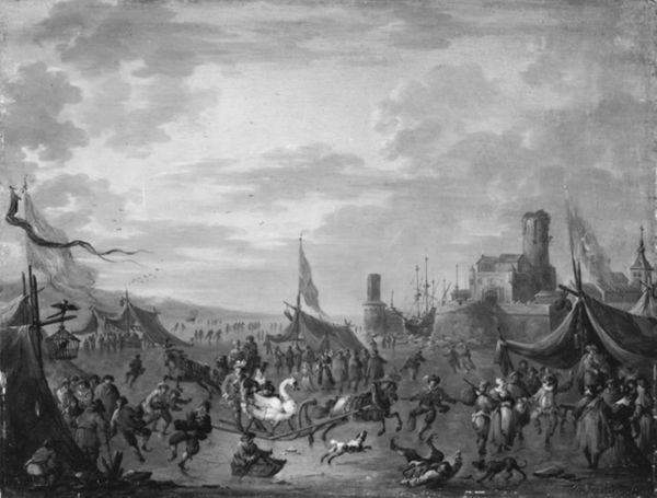 Curator: Here we have "Mountainous Coast with Fishing Boats and Fishermen on the Beach" a work that has been attributed to Lucas Smout the Younger, most likely dating from between 1686 and 1713. Editor: The first thing that strikes me is the busyness. A real flurry of activity; the eye scarcely knows where to land first! There's so much to unpack here, wouldn't you agree? Curator: Indeed. From a formal perspective, note how Smout uses a low horizon line. This compositional choice maximizes the prominence of the sky, those massive, billowing cloud formations dominating the scene. Editor: The sky feels so turbulent and powerful, looming almost oppressively over the vulnerable figures below. Water has long been seen as a potent symbol of both life and chaos, and the sheer number of ships crammed into this small coastal area... the collective unconscious certainly stirs when faced with such a potent image! Curator: Note how the artist juxtaposes these vessels with a rocky outcropping crowned with what seems to be a church or perhaps a fort. This division creates a spatial dichotomy, setting maritime activity against solid architectural stability. Semiotically, we could see this representing opposing forces—the transient and the enduring. Editor: Yes! And this coastal village becomes more than just a setting; it speaks to our innate desire for safe harbor. These buildings could be interpreted as a bulwark against existential dread, against the chaos represented by the sea. I am sure that the spire that shoots to the sky is to reinforce our psychological need to go upward to a higher power in difficult and unsafe times. Curator: Furthermore, let's consider the human element. Those figures on the beach, rendered in incredible detail considering the overall scope, engaged in commerce, leisure, or mere survival, really underscore the picture’s focus. Editor: It's quite remarkable. Through these scenes Smout depicts timeless struggles in visual shorthand; each element loaded with enduring meaning! It captures a shared heritage; echoes and repetitions of imagery resurfacing throughout centuries of artistic expression. Curator: Examining its elements gives an array of meanings behind it, and, as our exploration shows, it becomes more and more involved. Editor: The symbolic vocabulary certainly offers enduring possibilities, a visual poem for the ages!