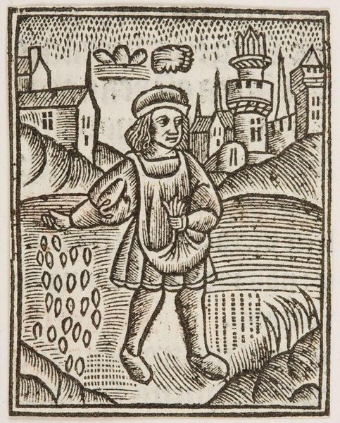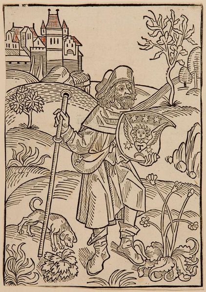 Editor: This woodcut, around 1488, is an illustration from Gerson, Opera, depicting Gerson as a pilgrim. It's anonymous, but the image has a solemn feel. What's your take? Curator: The weight of the world, right? That downturned gaze... but also, consider the shield. It’s a defense, yes, but also a badge of honor, almost alchemical. Notice the sun, moon, and stars. It hints at inner transformation during a pilgrimage. Editor: So it's not just about physical travel? Curator: Exactly! It’s a metaphor for a spiritual journey. The dog too, a symbol of loyalty, or the castle on the hill, perhaps a symbol of a spiritual goal. This pilgrim isn't just walking; he's becoming. Editor: I never would have picked up on those details. Thanks! Curator: Anytime! It all adds layers of meaning.