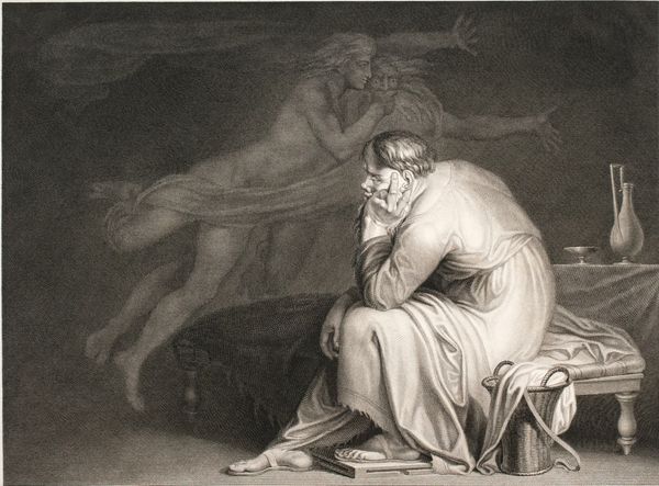 Ary Scheffer painted "Marguerite holding her dead child" using oil on canvas. Immediately, one's gaze is drawn to the stark contrast between the dark, tumultuous background and Marguerite's luminous figure. The artist uses light to isolate her and the dead child she cradles, intensifying the sense of isolation and despair. The composition is structured around a vertical axis, emphasizing Marguerite's stature, while diagonal lines lead the eye to other figures lurking in the shadows. These figures, shrouded in darker hues, seem to represent the societal condemnation and moral judgment she faces. Scheffer masterfully employs color to evoke emotion. The cold, pale tones of Marguerite's skin contrast with the warmer, earthier colors of the figures offering judgement, creating a visual tension that mirrors the narrative's conflict. This painting delves into themes of guilt, shame, and societal judgment, challenging viewers to reconsider conventional moral categories and ponder the structural forces that shape individual fates.