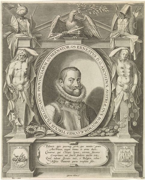 This engraving of Justus Lipsius was created by Theodoor Galle in the late 16th or early 17th century. Galle immortalizes the humanist philosopher within a framework of allegorical figures and Latin inscriptions. Consider how Lipsius's identity as a scholar is constructed through visual and textual cues. The figures of Virtus, Doctrina, and Modestia that surround his portrait were central to the construction of masculine identity and civic virtue during the Renaissance. The inscription emphasizes Lipsius's mind, spirit, and face as worthy of artistic representation. How does this portrayal reflect the values and ideals of the time? The choice of Latin for the inscriptions positions Lipsius within a tradition of classical learning and intellectual authority, shaping perceptions of his identity and legacy. This engraving is not just a portrait, but a carefully constructed statement about intellectual and moral character, inviting us to reflect on the values we associate with leadership and knowledge.