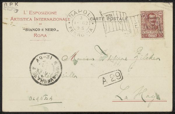 Editor: So, here we have “Briefkaart aan Philip Zilcken,” possibly from 1902. It looks like ink on paper – a personal correspondence of some kind. It feels very immediate, very tactile, almost like holding a little piece of history. What can you tell me about this work? Curator: Well, beyond its obvious function, this piece is deeply embedded within a specific socio-political moment. As a postcard sent to Philip Zilcken around 1902, its existence speaks to the rise of mass communication and its effect on individual lives. The Italian postage indicates its origins, inviting us to consider Italy's political climate at the turn of the century and its relationship to the art world. What strikes you about the sender's choice to send this card? Editor: I suppose the immediacy of a postcard versus a letter. Was there a specific artistic or cultural exchange happening between Italy and the Netherlands at this time that influenced its creation or its journey? Curator: Exactly. The very act of sending artwork through postal systems highlights broader questions of accessibility and cultural dissemination. Consider how Zilcken himself might have experienced this image, filtered through the lens of his own social and cultural background. How might Zilcken have seen himself in relation to the message or sender and Italy itself? Editor: I never considered the perspective of the receiver, I see what you mean. Thanks for opening my eyes to this historical and personal intersection. Curator: Absolutely! It shows how even seemingly simple artworks can become powerful tools for understanding our shared past and how our identities shape our engagement with art.